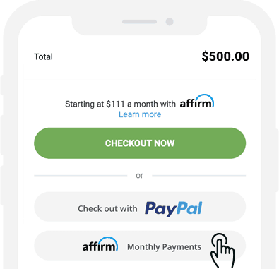 With Affirm you can get your order right away and split your purchase into multiple payments to pay back over time. Choose the payment schedule that works best for you – 3, 6, 12, 18, or 24-month financing with rates from 10-36% APR. When you finance with Affirm you see the approved loan amount, interest rate, total interest you will pay, and the number of months that you have to pay off your loan all before signing up.