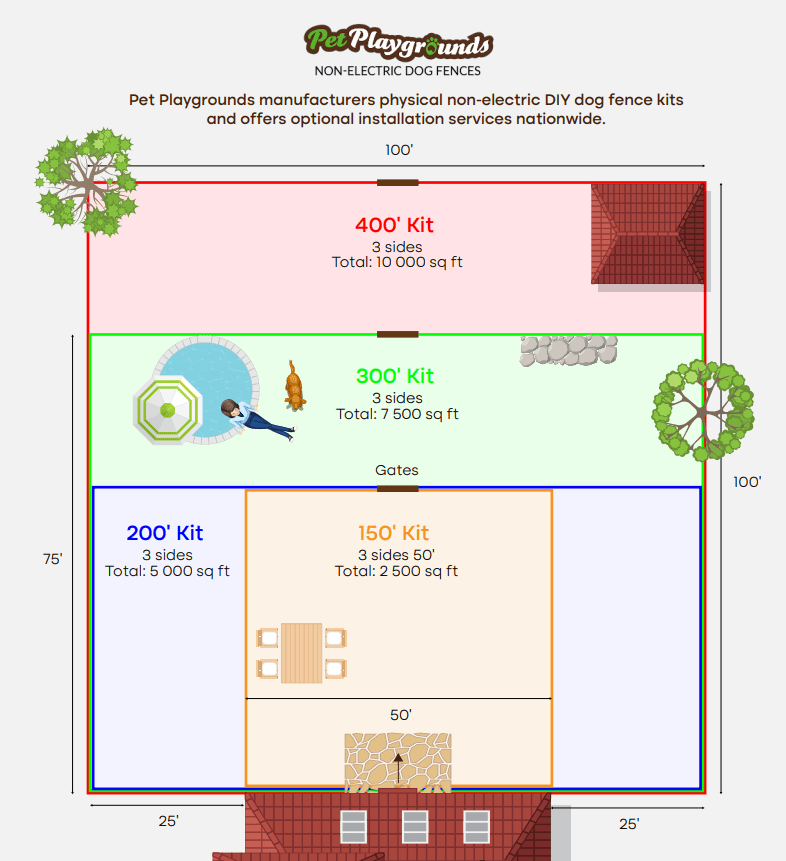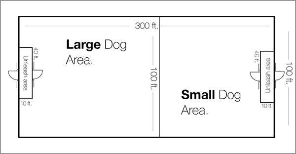 The example shown here is a common layout for a community dog park. This is just an example of one design. We can customize every commercial kit for your specific needs. Wholesale pricing is available for kits 2,000 linear feet or more. If you’re ordering under 2,000 linear feet please order a dog fence kit online.