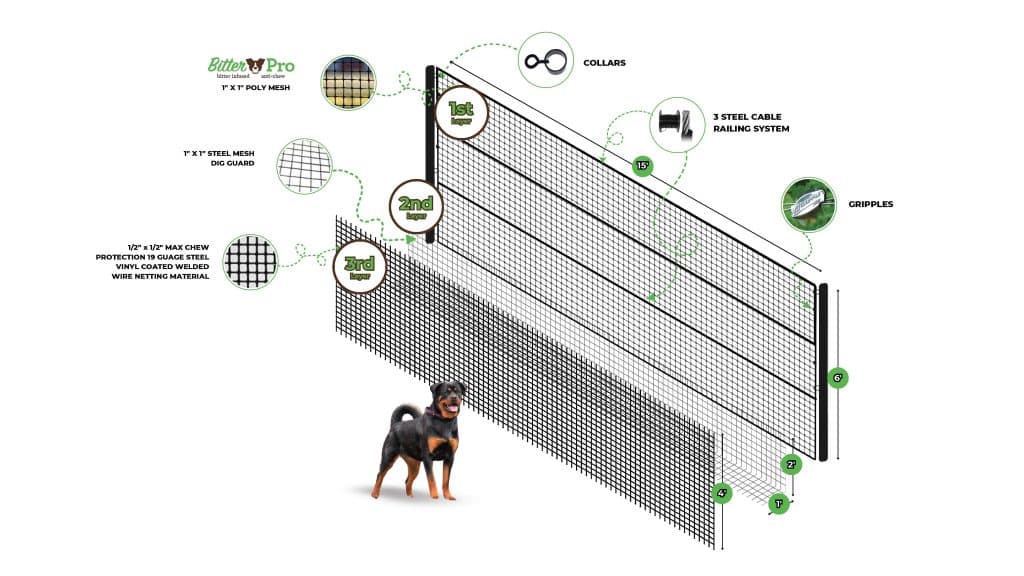 Pet Playgrounds Dog Fence Kits are incredibly effective. The anti-climb feature ensures that your dog can’t use the fence as a ladder, and the anti-dig feature prevents them from tunneling out. Our fences are made from durable materials like 1,100-pound break strength Polypropylene Mesh and 1,800 PSI break strength Rubber Coated Welded Steel Wire Mesh, making them nearly impossible for dogs or predators to breach.