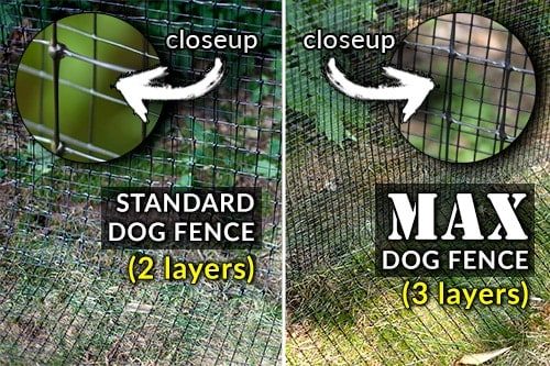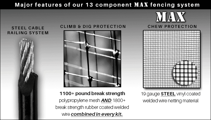 Our standard dog fence can withstand up to 1000 pounds of pressure per square inch or more (PSI). In comparison, most chain link fences handle only about 1,000 PSI, while wood fences typically withstand between 550 and 700 PSI PSI. Vinyl fences are even weaker. We have encountered falling trees that couldn’t break our fence—it’s that strong. Its design includes a slight amount of flex similar to that of a suspension bridge, allowing all 12 or 13 components to work together effectively. However, if you have a determined canine that spends hours chewing, ripping, pulling, and tearing at anything, our MAX STRENGTH fence is exactly what you need. We have enhanced our existing fencing layers by incorporating 19-gauge steel, vinyl-coated netting material 1/2 inch square, which provides superior containment and chew protection inside or out. We offer support seven days a week, along with detailed installation videos and written instructions. We recommend using both resources together for the best results, especially when considering a MAX installation at heights of 6 or 7 feet.