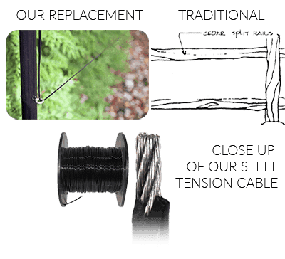 All our kits include unique steel rail cables – 2 for a 2 layer kits and 3 for Max strength 6ft tall and coming 2024 4 cables rails for 7ft max Cabled rails makes our fence almost impossible to climb in or out, simple to install on hills or uneven ground , Low visibility similar to modern railings and resilient to tree branches – sever weather of any kind…
