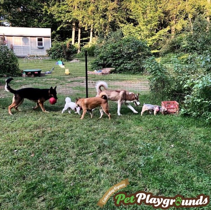 Pet Playgrounds offers a real, physical dog fence in a complete kit engineered specifically for dogs. Refined and improved for over 15 years, our fence is NOT an electric fence. Kits come with all the components needed to create a safe and secure play space for your dog on almost any terrain. Typically, up to 200 linear feet can be installed in one day by almost anyone!