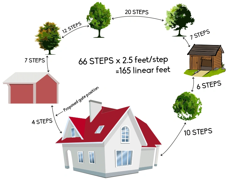 Use the interactive map below to estimate how many linear feet of fencing you need. Simply search your address, then click on the map to mark your fence corners or path. You can drag points to fine-tune them, and the total distance will automatically update in feet.